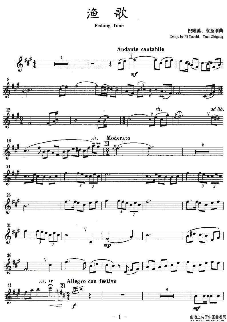 渔歌(单簧管)相关五线谱