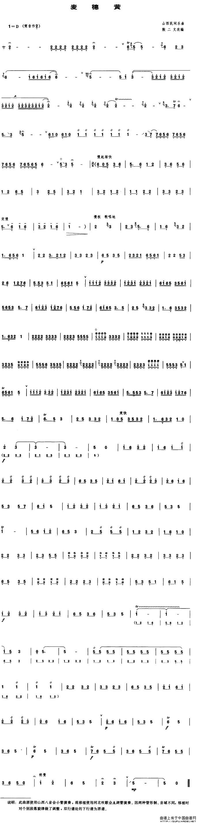 麦穗黄(管子谱)相关五线谱