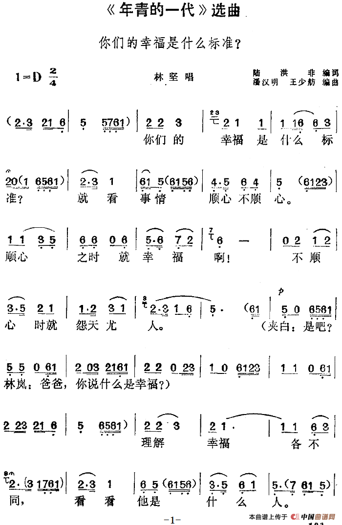 《年青的一代》选曲:你们的幸福是什么标准(林坚唱段)相关五线谱