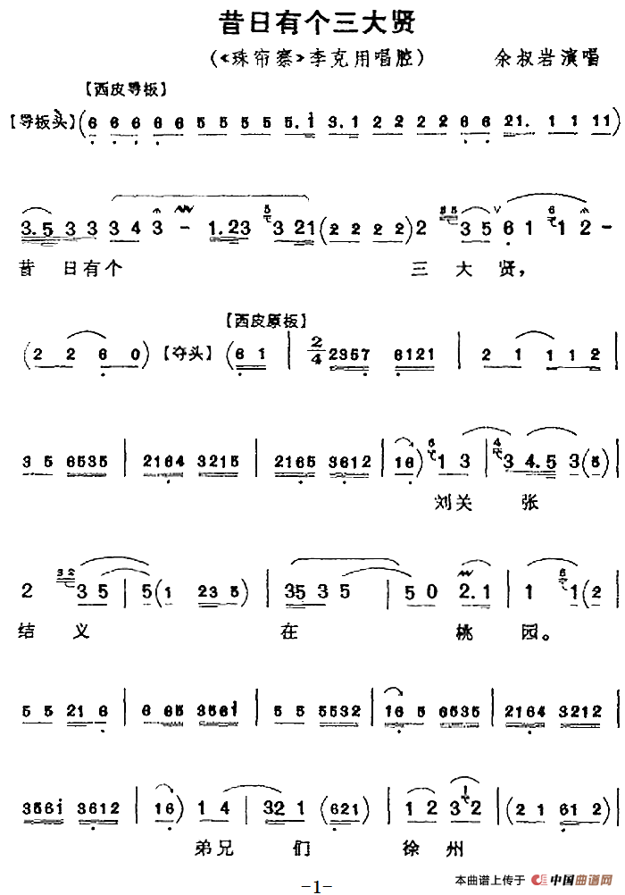 昔日有个三大贤(《珠帘寨》李克明唱段、琴谱)