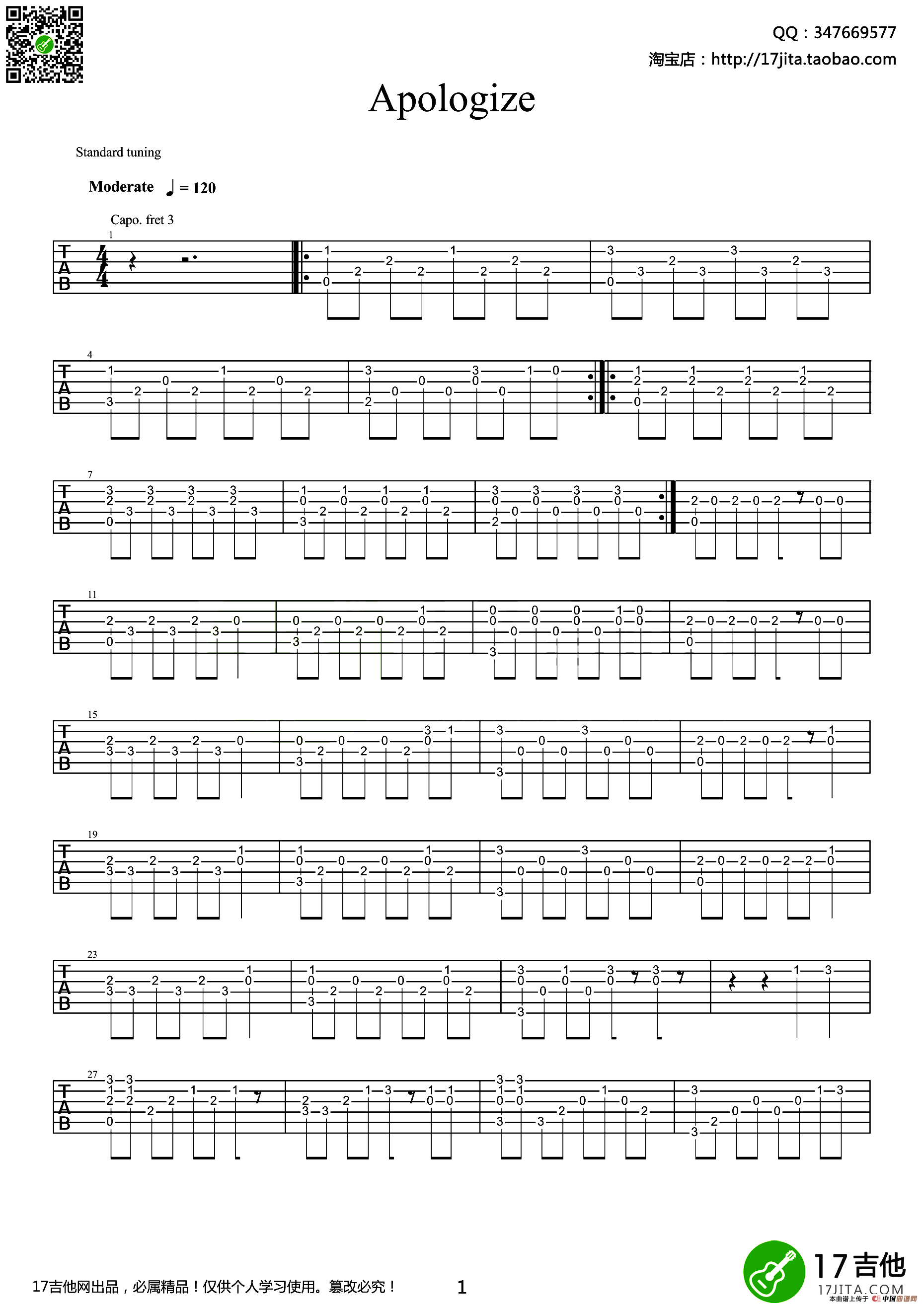 Apologize(指弹吉他谱)相关五线谱