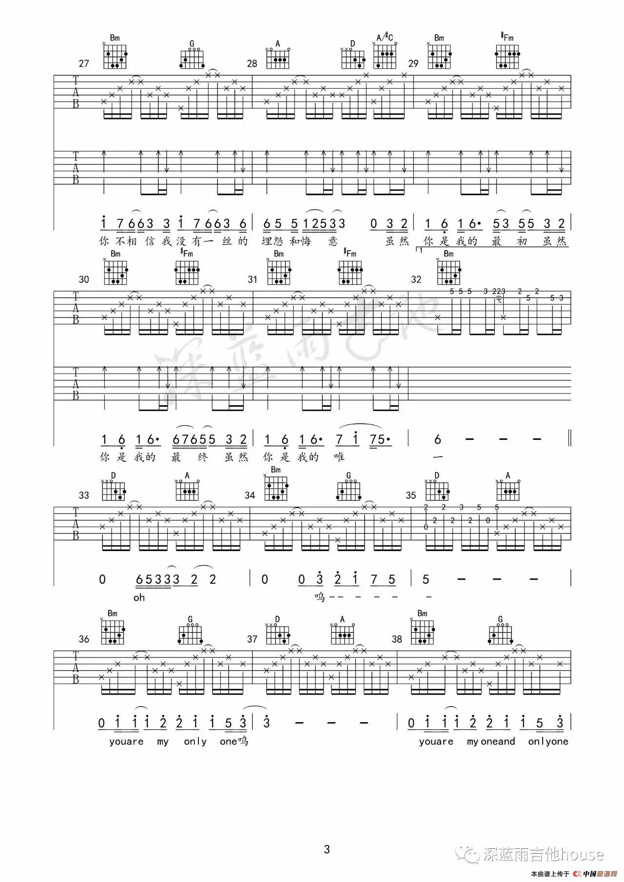 你是我的唯一(深蓝雨吉他编配)相关五线谱
