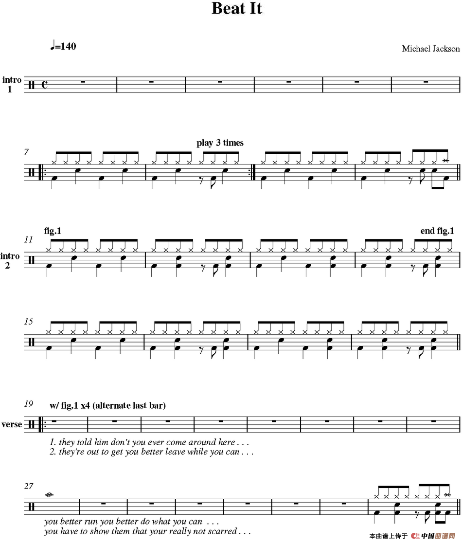 爵士鼓谱:Michael Jackson - Beat it相关五线谱