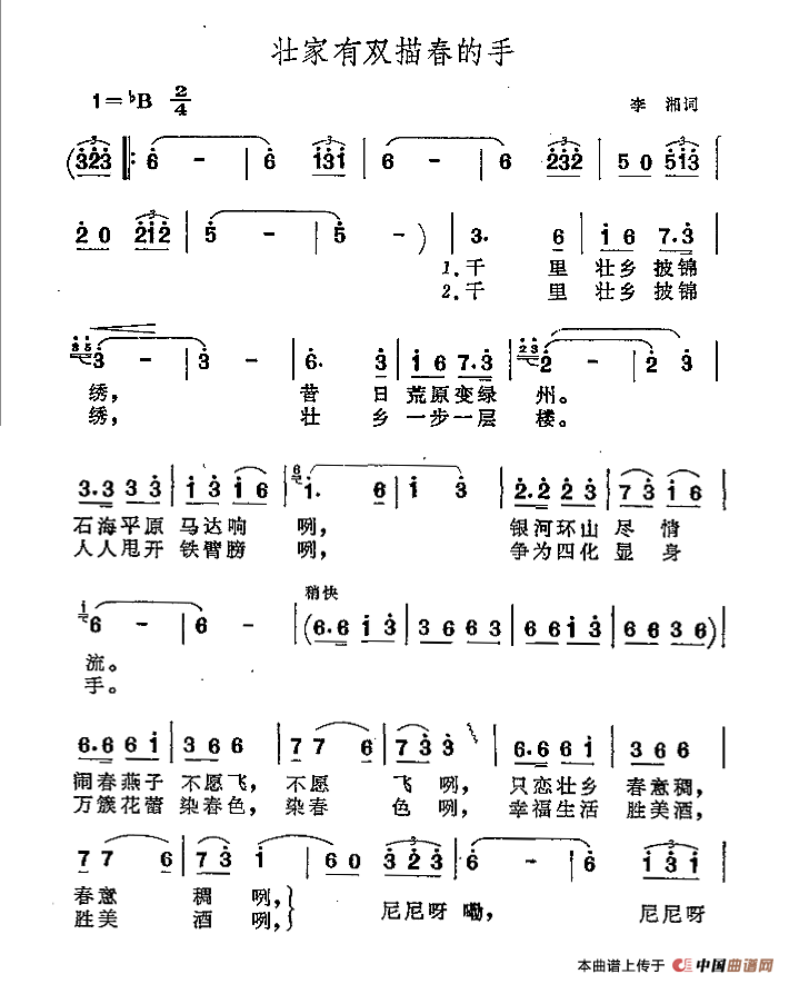 壮家有双描春的手相关五线谱