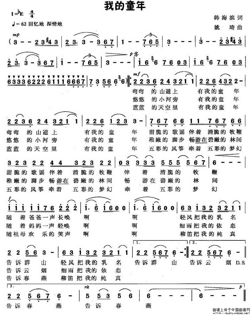 我的童年(韩海滨词 姚琦曲)相关五线谱