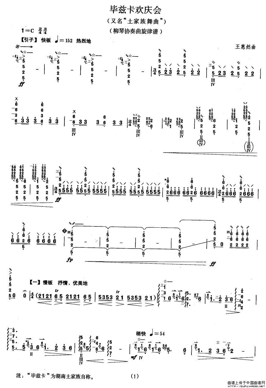 柳琴考级曲目八级:毕兹卡欢庆会(又名“土家族舞曲”)相关五线谱
