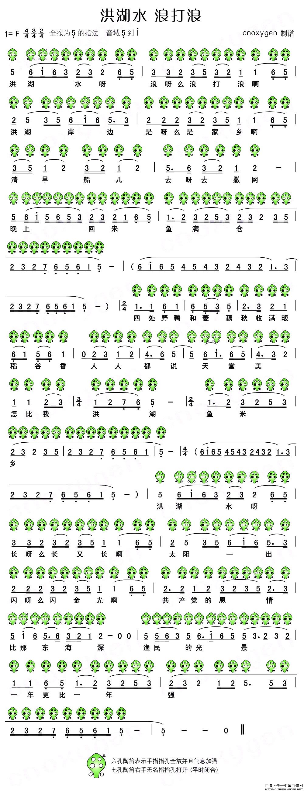 洪湖水 浪打浪(六孔陶笛谱)
