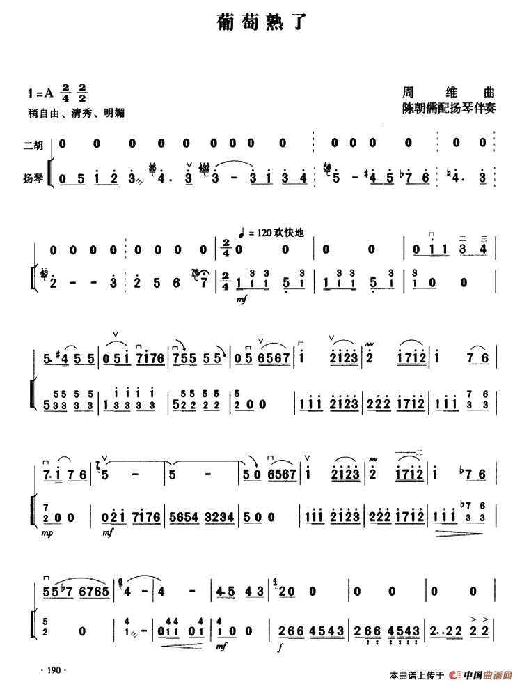 周维曲谱推荐葡萄熟了(二胡+钢琴伴奏)锦绣江山随想曲(二胡独奏)(小小张制谱)愉快的星期天(周维词 周维曲)美国往事随想曲天山天池红颜(黄小名词 周维华曲)普光,太阳的故乡(独唱+伴唱)母亲(符小凌词 周维华曲)白鸽的问候(合唱)母亲的胸怀(刘钦明词 周维华曲)马头琴的传说(罗忠义 词 周维华曲)莫斯科的回忆葡萄熟了(二胡+钢琴伴奏)葡萄熟了(精益制谱版)锦绣江山随想曲澳大利亚随想曲鸽子的风格莫斯科的记忆雪山的祈祷宁夏川是个好地方