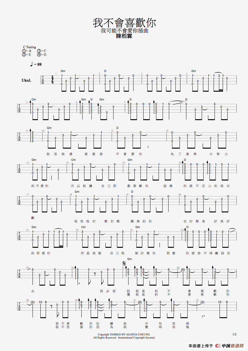 我不会喜欢你(尤克里里指弹独奏)相关五线谱
