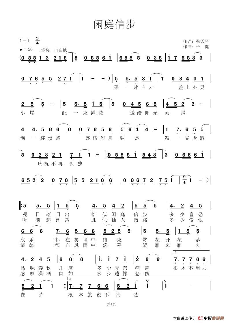 子健曲谱推荐二月二龙抬头桂花园最美湖南清明凭吊荷塘莲花开笑看人生别样丰农家三月我们欢快地跳(表演唱)唱晚科学家的摇篮苦也悄悄 累也悄悄田园乐回家过年(庞晓静词 子健曲)我心中的星大美呀周口倦鸟春风颂(吴天海词 子健曲)月光光,明晃晃(童声小合唱) 醉花阴([宋]李清照词 子健曲)社会主义好(——抗疫原创歌曲之四)