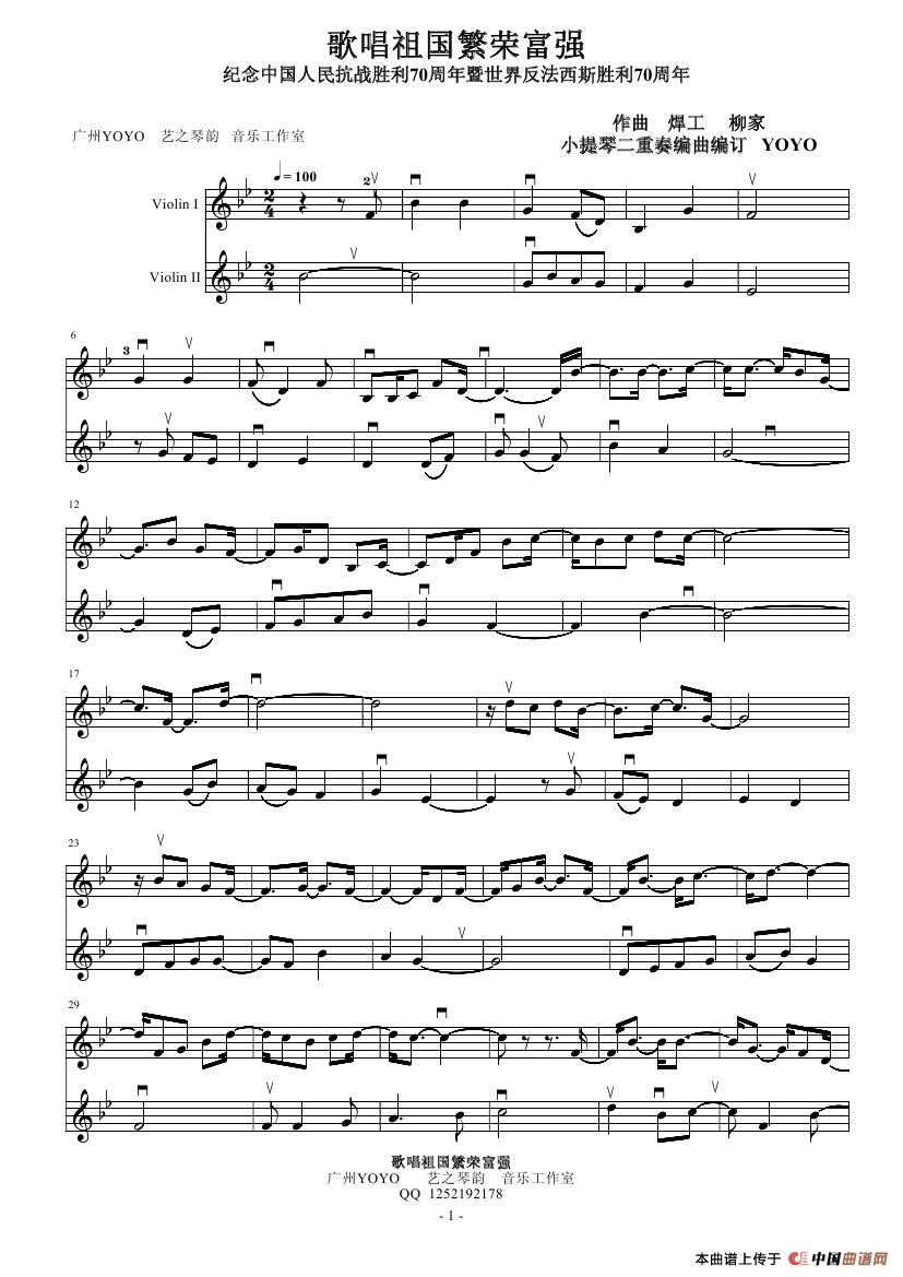 歌唱祖国繁荣富强(小提琴二重奏)(小提琴谱)相关五线谱