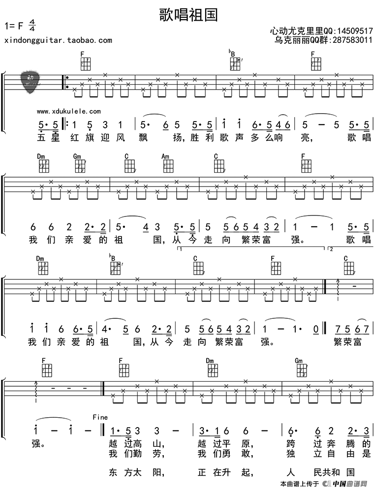 歌唱祖国(ukulele四线谱)相关五线谱