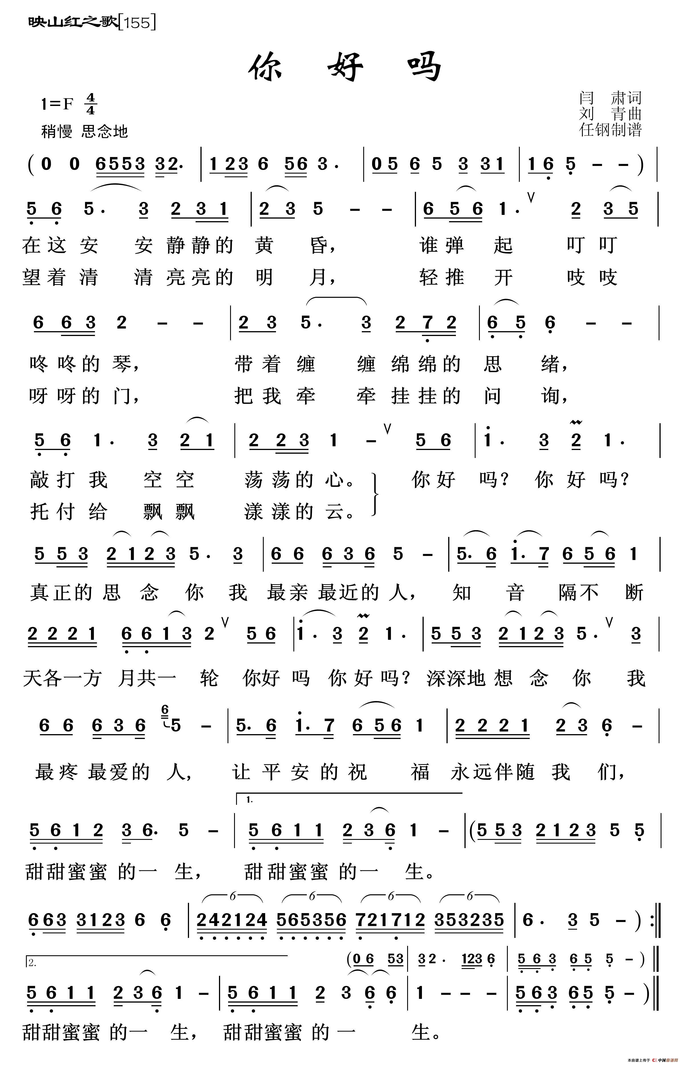 刘青曲谱推荐当人民需要的时候我不想说再见(电视剧《至爱亲朋》主题曲)我不想说再见(冯小刚词 刘青曲)你我他(车行词 刘青曲)终能走到头(电视剧《人间芙蓉色》插曲)天下常熟湖山秀亲爱的人祖国万岁(朱海词 刘青曲)亲爱的人(予子词 刘青曲)祖国万岁(朱海词 刘青曲)中国加油!四川加油!祖国你好(刘青、小明词 刘青曲)我爱我的祖国(吉炳轩词 刘青曲、正谱)东方红又红(朱连玮词 刘青曲)清廉颂好日子自己会走过来(电视剧《乡间多少情》主题曲)西南大学校歌祖国万岁(老人适用)梦花(电视剧《小楼风景》片尾歌)我们是祖国的希望(金本词 刘青曲、合唱)