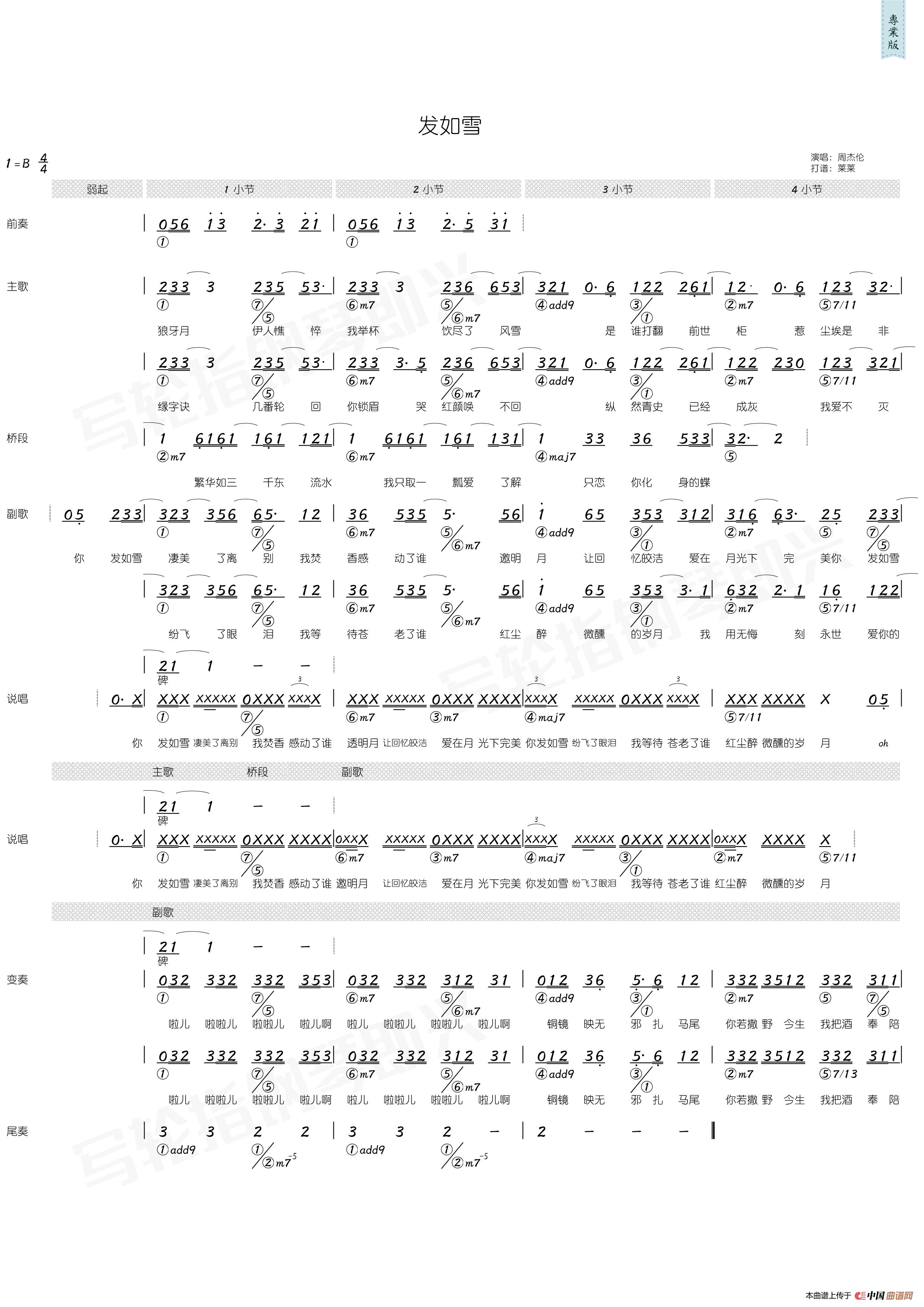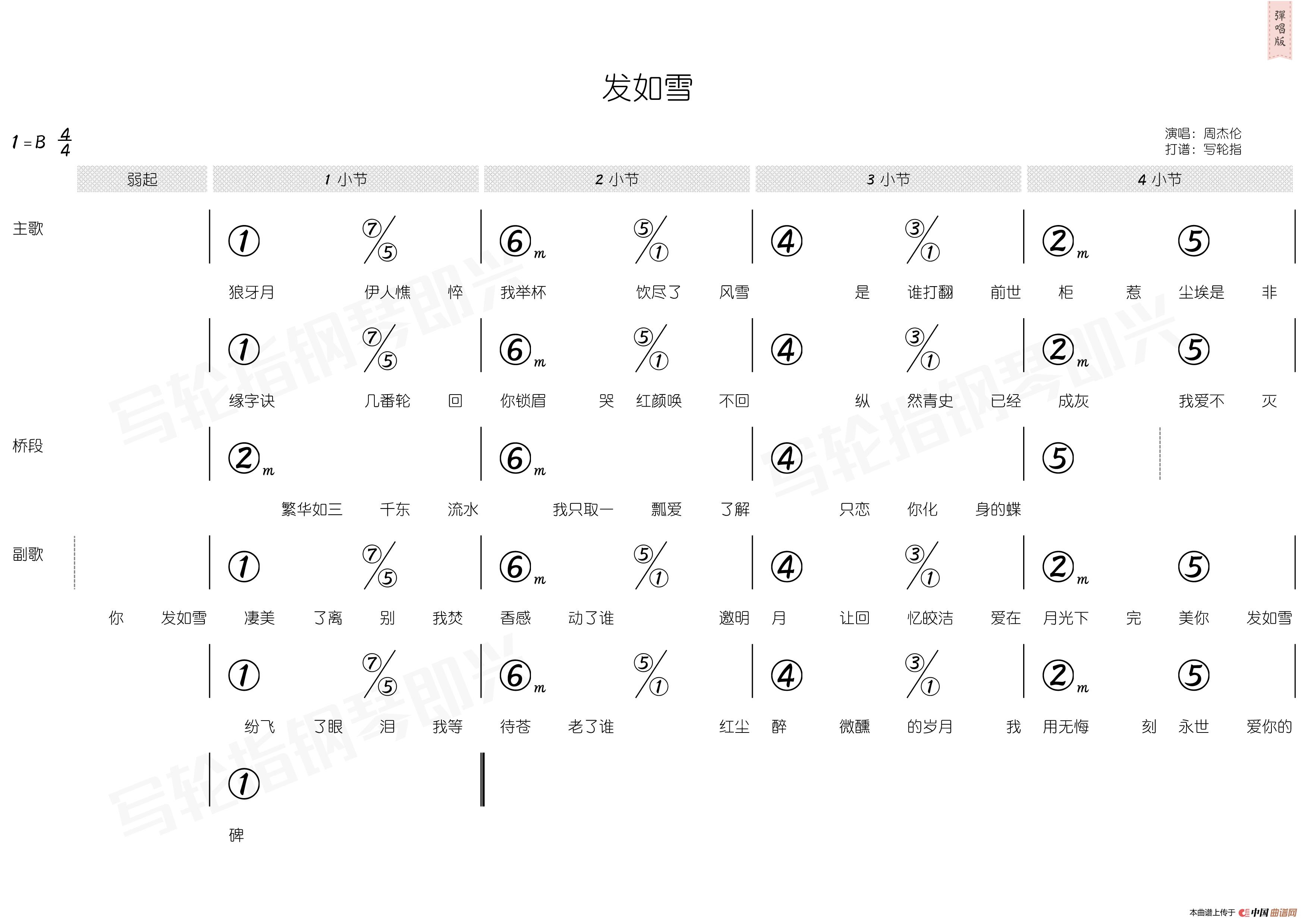 周杰伦曲谱推荐暗号断了的弦(编配乐谱)流浪诗人(编配乐谱)世界末日(小提琴+钢琴伴奏)菊花台(足球小将制谱版)枫(方文山词 周杰伦曲)甜甜的(拇指琴卡林巴琴演奏谱)青花瓷(带和弦、五线谱)牛仔很忙轨迹(电影《寻找周杰伦》主题曲、编配乐谱)屋顶(编配乐谱)爷爷泡的荼晴天(周杰伦词曲)白色风车轨迹爱在西元前千里之外(钢琴弹唱谱)如果你也听说发如雪(《蛐蛐钢琴网》2个版本)发如雪