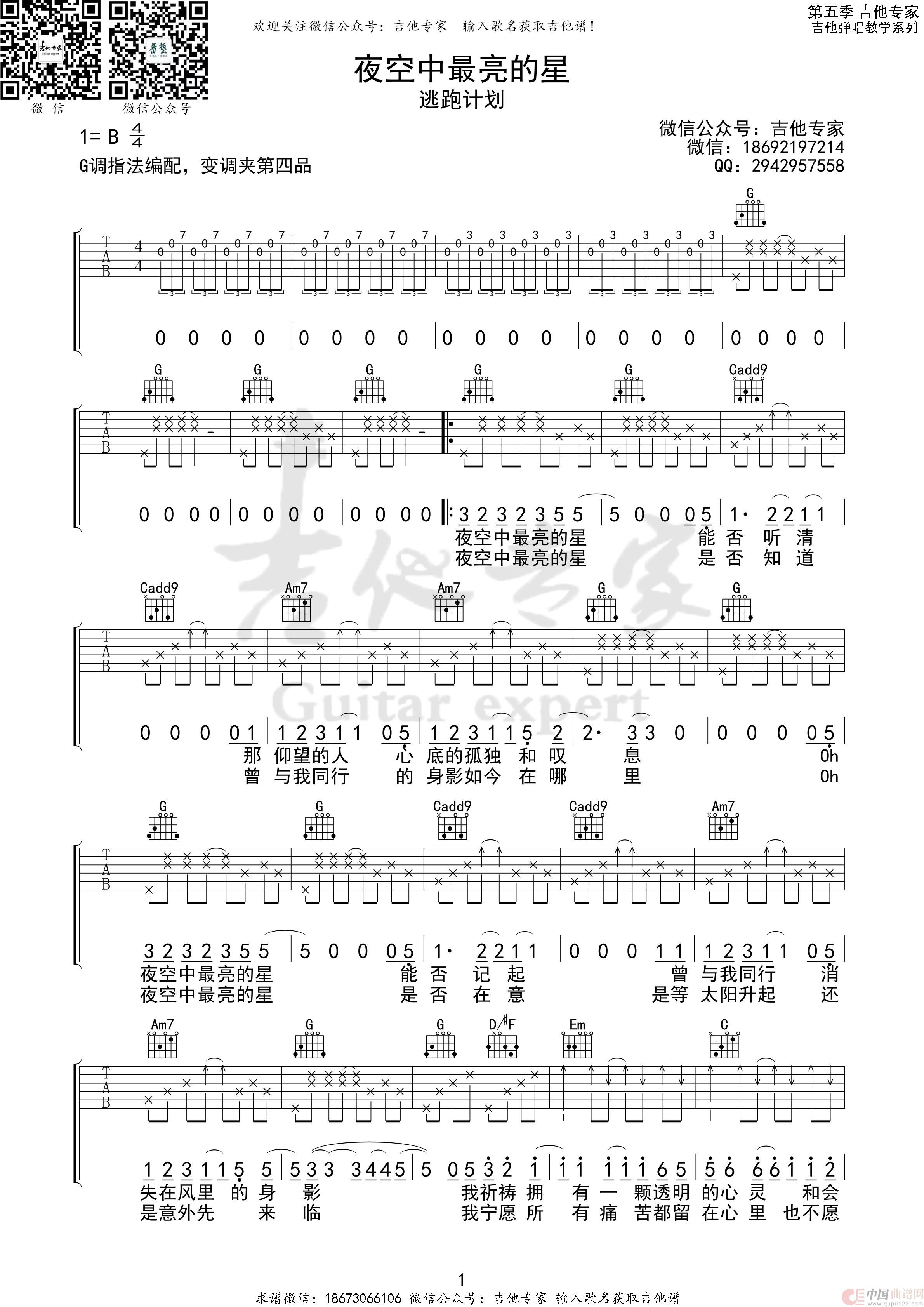 夜空中最亮的星(免费吉他谱)相关五线谱