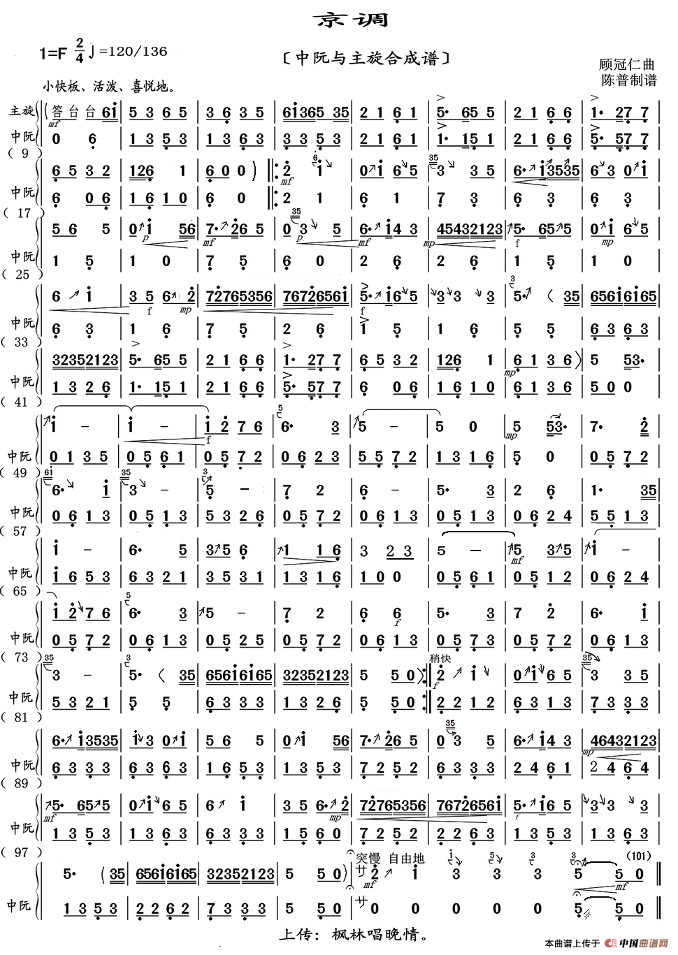 顾冠仁曲谱推荐京调(曲笛二重奏)春晖曲(小三弦曲谱)京调(箫)京调(新笛分谱)春辉曲(二胡曲.章祥兴弓指法)京调(倍大分谱)采茶灯(柳琴分谱)京调(二胡与主旋合成谱)京调(民乐合奏总谱)苏堤漫步2-2(民乐小合奏)京调(葫芦丝曲谱)采茶灯(笙分谱)顾山春(器乐合奏主旋谱)京调(京剧曲牌)京调(琵琶分谱)苏堤漫步(大提琴分谱)京调采茶灯(民乐小合奏总谱)苏堤漫步(吊钗、月锣、小钹分谱)京调(扬琴与主旋合成谱)