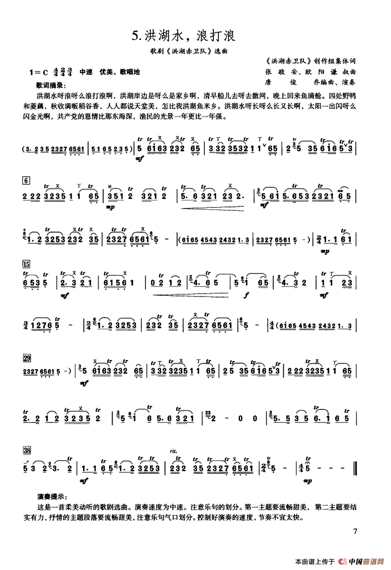 洪湖水,浪打浪相关五线谱