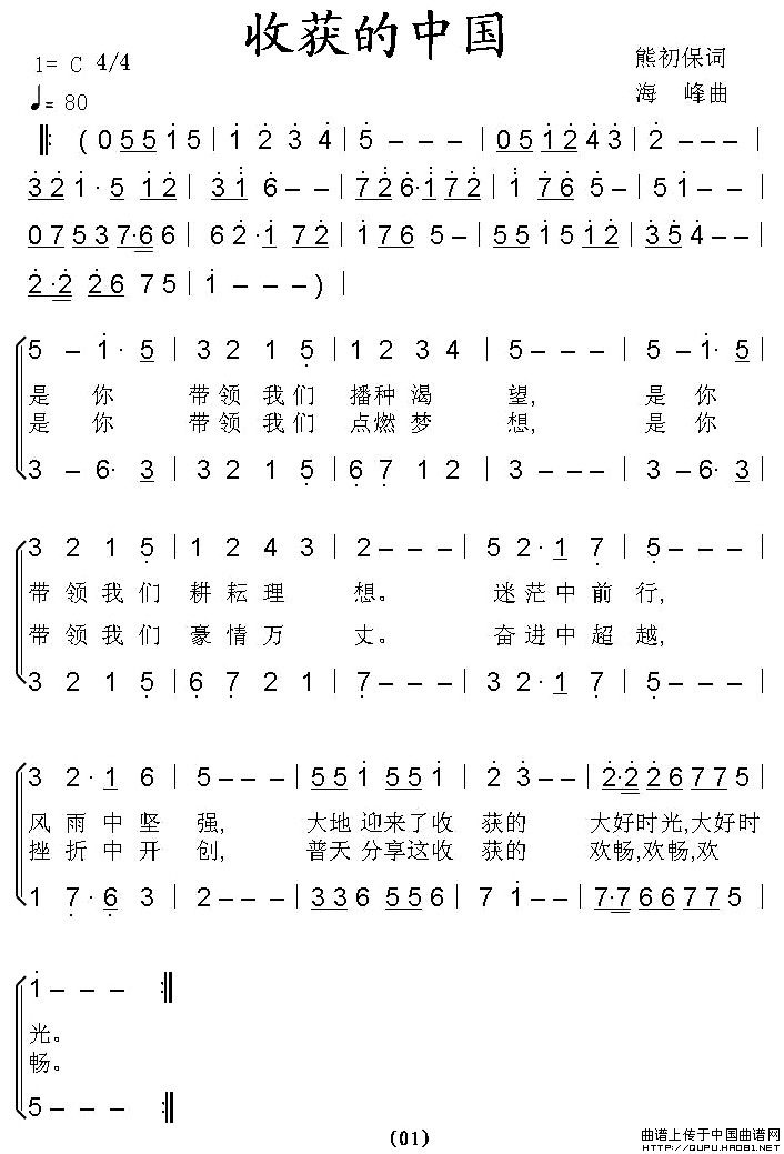 收获的中国(熊初保词 海峰曲)相关五线谱