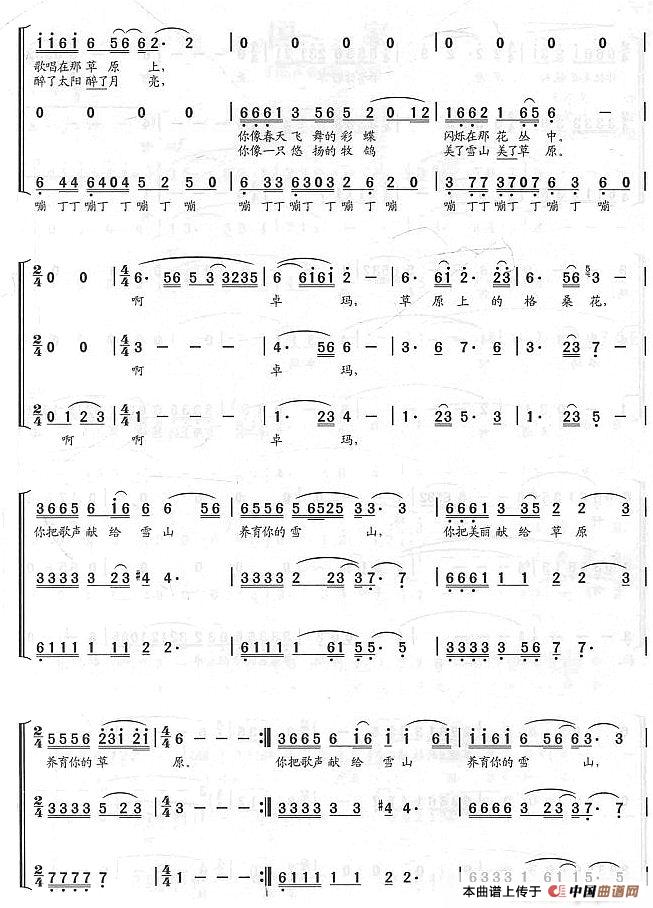 卓玛(真知词 秋加措曲、陈国权编合唱)相关五线谱