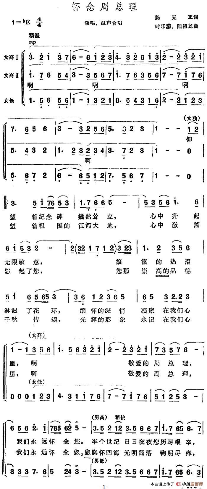 怀念周总理(陈克正词 时乐蒙、陆祖龙曲)