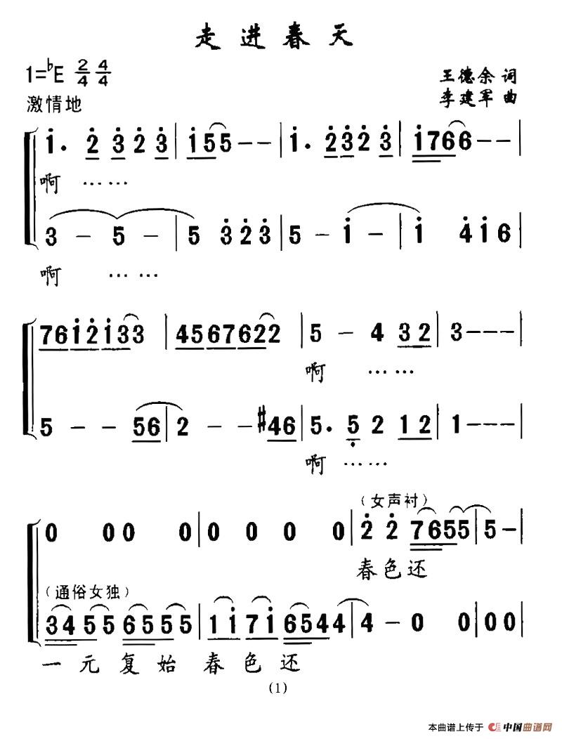 李建军曲谱推荐春天的歌谣(徐继东词 李建军曲)我是你的快乐阳光清亮亮的小河十八岁的眼睛清亮亮的小河文化志愿者之歌蓝色之恋(祝福词 李建军曲)雪山的女孩爱唱歌(代伐钟词 李建军曲)小雪橇(晨枫词 李建军曲、合唱)无影灯下(独唱+伴唱)天下打工一家亲(李建军曲)妈妈的红头巾(李幼容词 李建军曲)红红的日子(祝福词 李建军曲)老师的目光(祝福词 李建军曲)我多像一只小鸟迎来春色换人间(混声合唱)男孩女孩(徐连君词 李建军曲)绿色的大蝈蝈(合唱)重振雄风奔向美好的明天(李建军词 李建军曲)