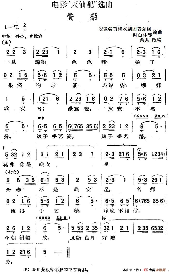 桑弧改编 安徽省黄梅戏剧团音乐组、时白林等编曲曲谱推荐电影“天仙配”选曲:仙女织绢(女声齐唱)电影“天仙配”选曲:今日回家电影“天仙配”选曲:槐荫开口电影“天仙配”选曲:父王二次下旨电影“天仙配”选曲:从空降剑电影“天仙配”选曲:仙女四赞电影“天仙配”选曲:分别电影“天仙配”选曲:父王下旨电影“天仙配”选曲:剧终合唱电影“天仙配”选曲:互表身世电影“天仙配”选曲:天宫岁月电影“天仙配”选曲:变村姑电影“天仙配”选曲:槐荫别电影“天仙配”选曲:哑木头电影“天仙配”选曲:下凡电影“天仙配”选曲:钟声催归电影“天仙配”选曲:拜谢大姐电影“天仙配”选曲:卖身纸电影“天仙配”选曲:满工对唱