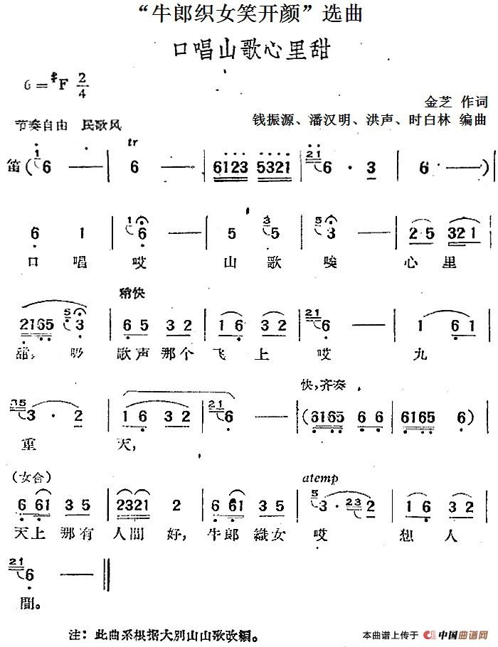 钱振源、潘汉明、洪声、时白林编曲曲谱推荐“牛郎织女笑开颜”选曲:赞人间“牛郎织女笑开颜”选曲:撒片白云擦擦汗“牛郎织女笑开颜”选曲:英雄爱唱正义歌“牛郎织女笑开颜”选曲:河边气走了二郎神“牛郎织女笑开颜”选曲:车水谣“牛郎织女笑开颜”选曲:霞光缭绕飞彩云“牛郎织女笑开颜”选曲:天河水干泪也干“牛郎织女笑开颜”选曲:龙王诉苦“牛郎织女笑开颜”选曲:万条蛟龙接上天
