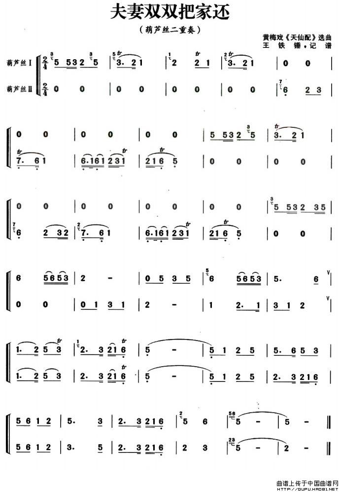 夫妻双双把家还(葫芦丝二重奏)相关五线谱