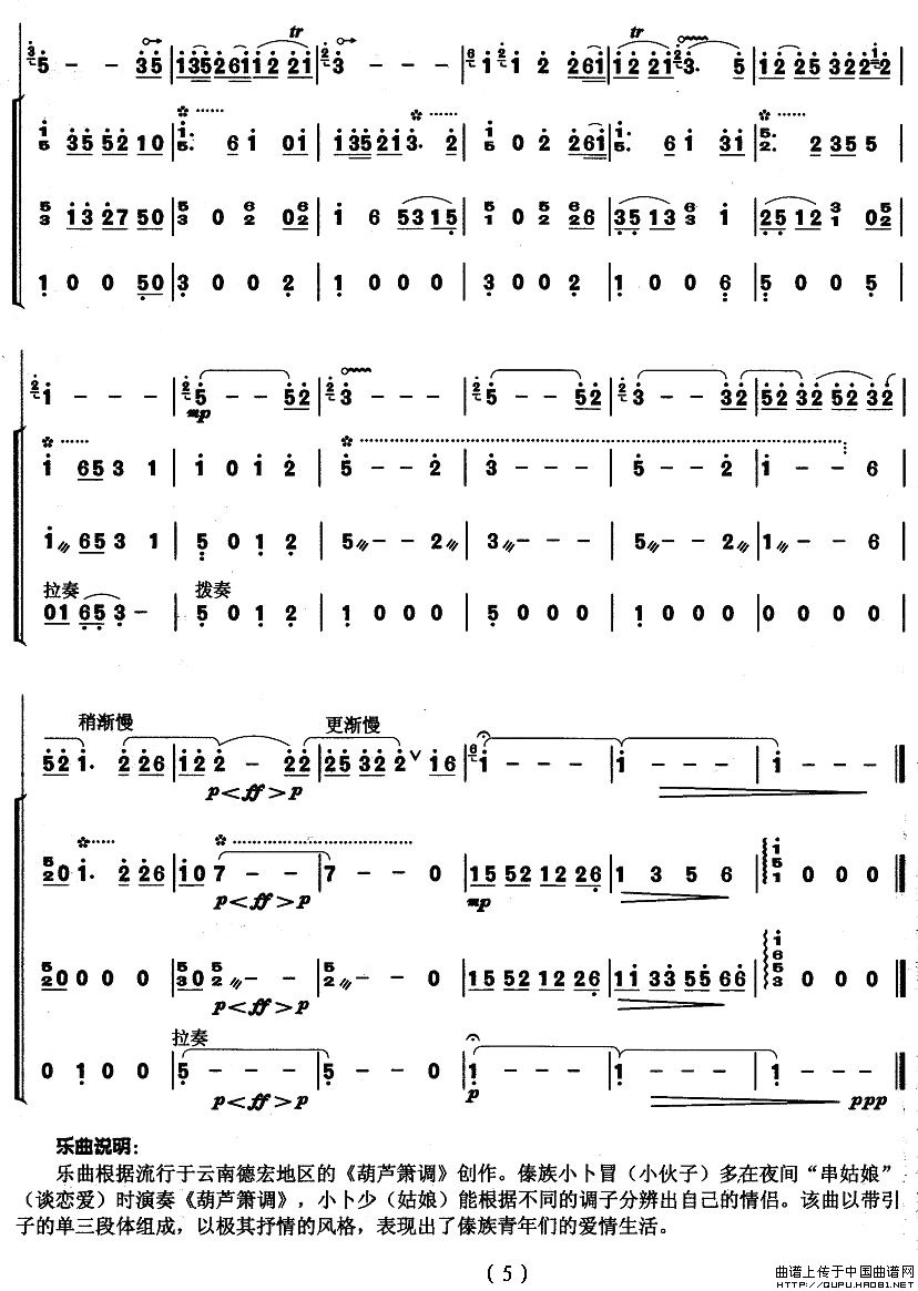 竹林深处(葫芦丝+琵琶+扬琴+低音提琴)相关五线谱
