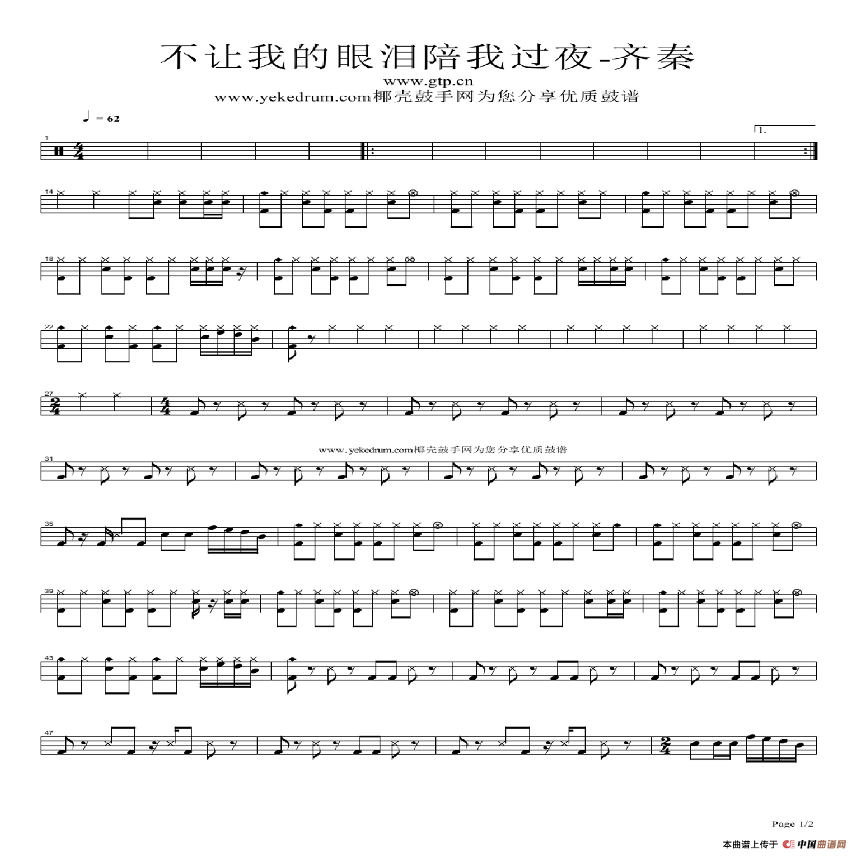 不让我的眼泪陪我过夜(架子鼓谱)相关五线谱