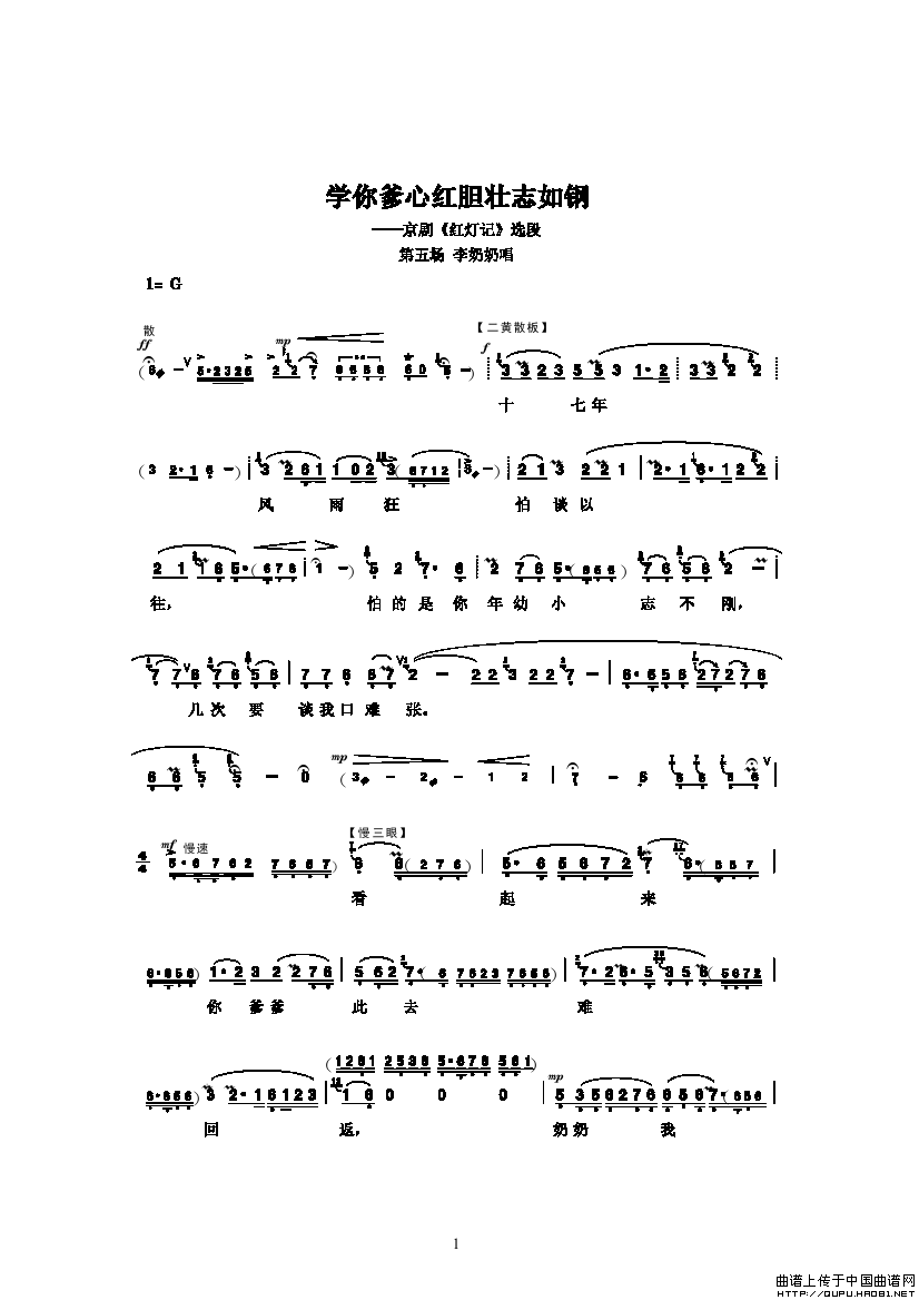 学你爹心红胆壮志如钢(《红灯记》选段)相关五线谱