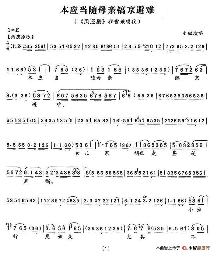 本应当随母亲镐京避难(《凤还巢》程雪娥唱段)相关五线谱