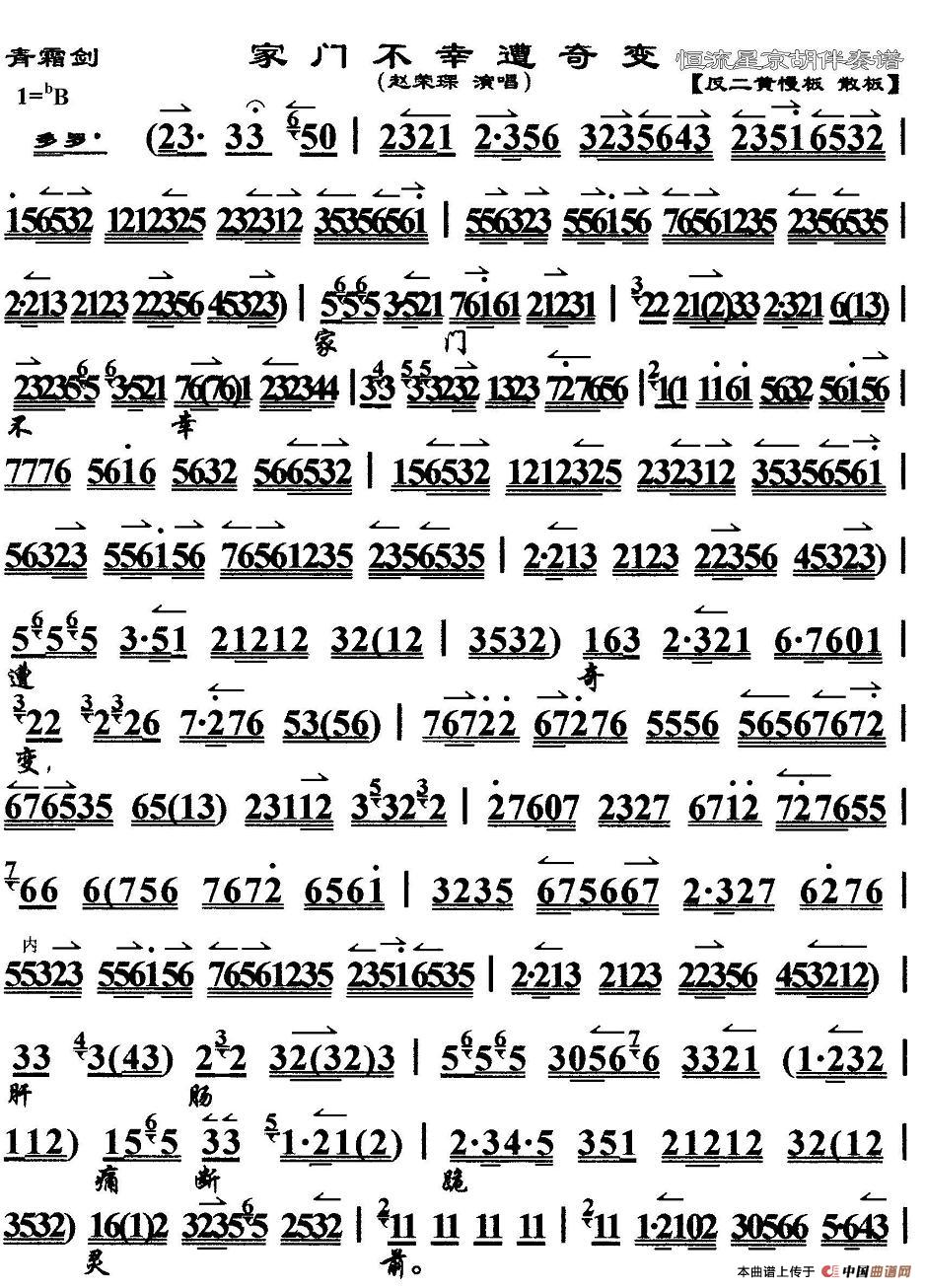 家门不幸遭奇变(《青霜剑》选段、京胡伴奏谱)
