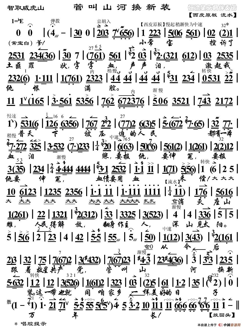 管叫山河换新装(《智取威虎山》选段、琴谱)相关五线谱