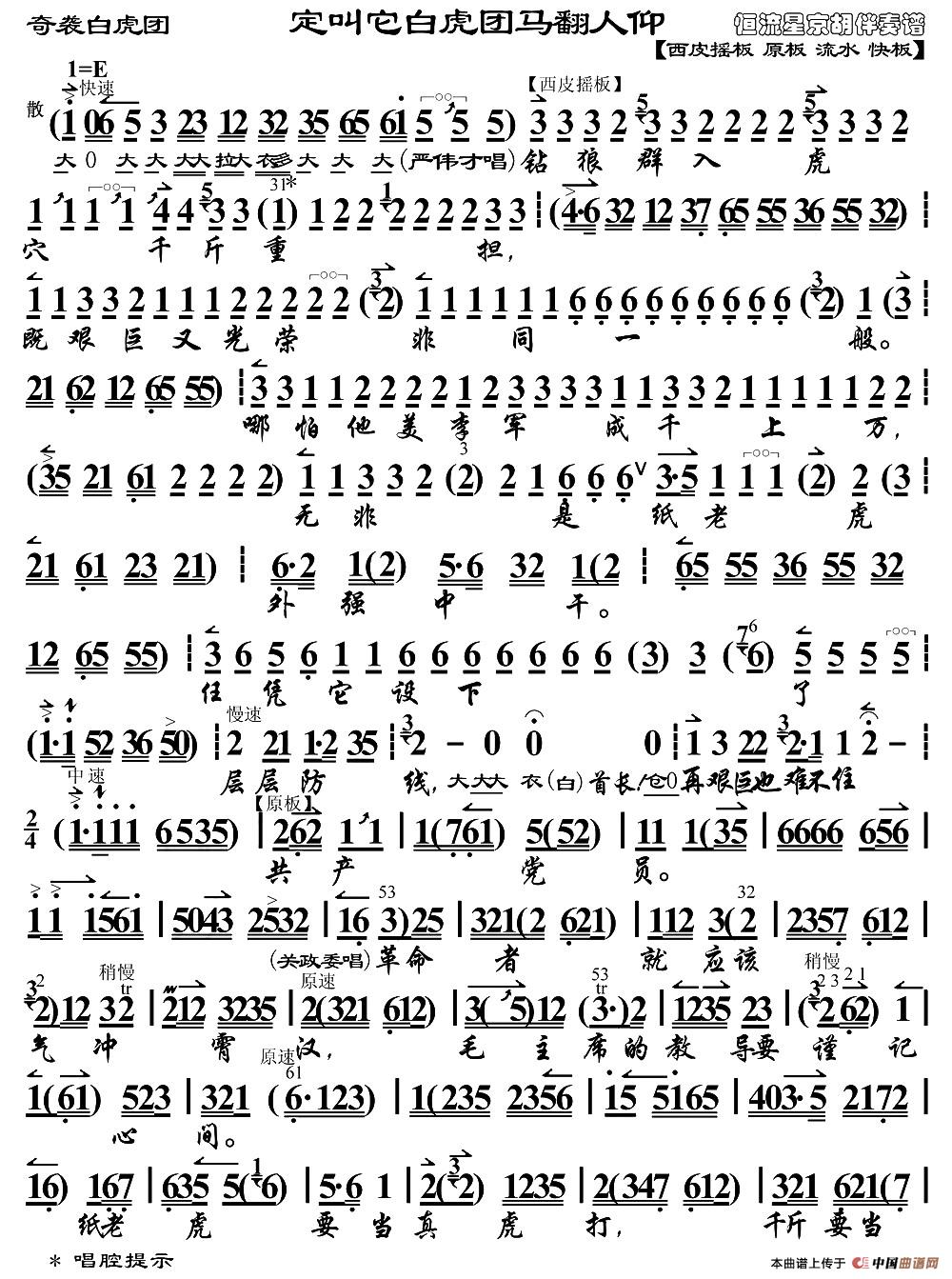 定教他白虎团马翻人仰(《奇袭白虎团》选段、琴谱)相关五线谱