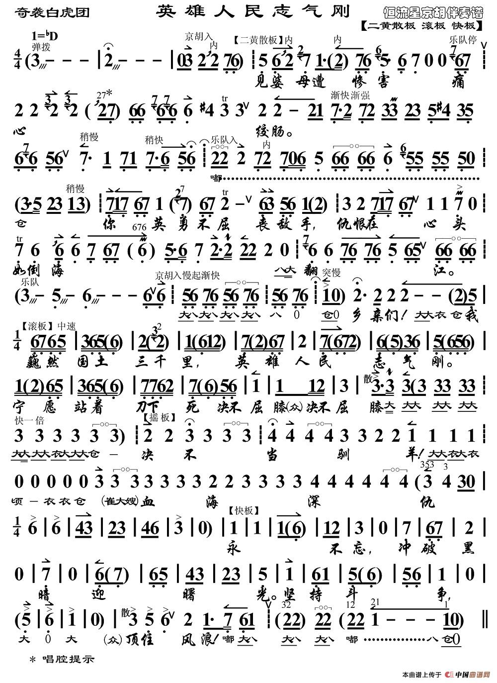 英雄人民志气钢(《奇袭白虎团》选段、琴谱)相关五线谱