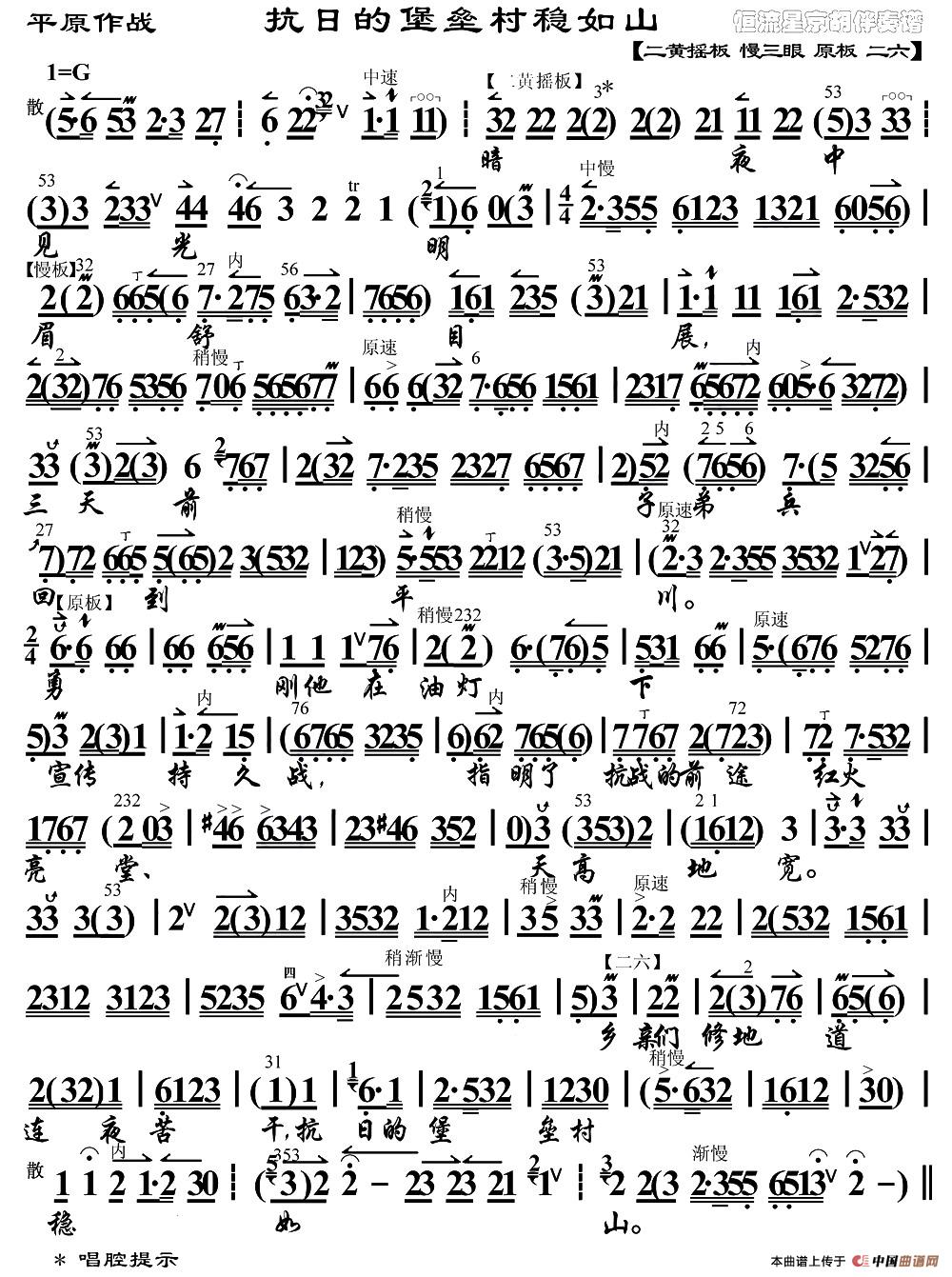抗日的堡垒村稳如山(《平原作战》选段、琴谱)相关五线谱