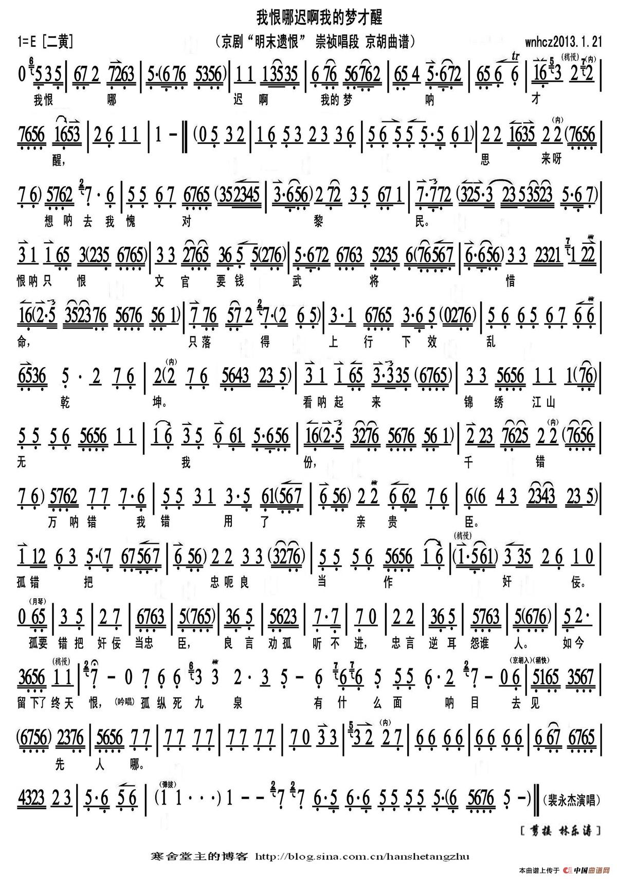 我恨那迟啊我的梦才醒(《明末遗恨》崇祯唱段、京胡曲谱)相关五线谱