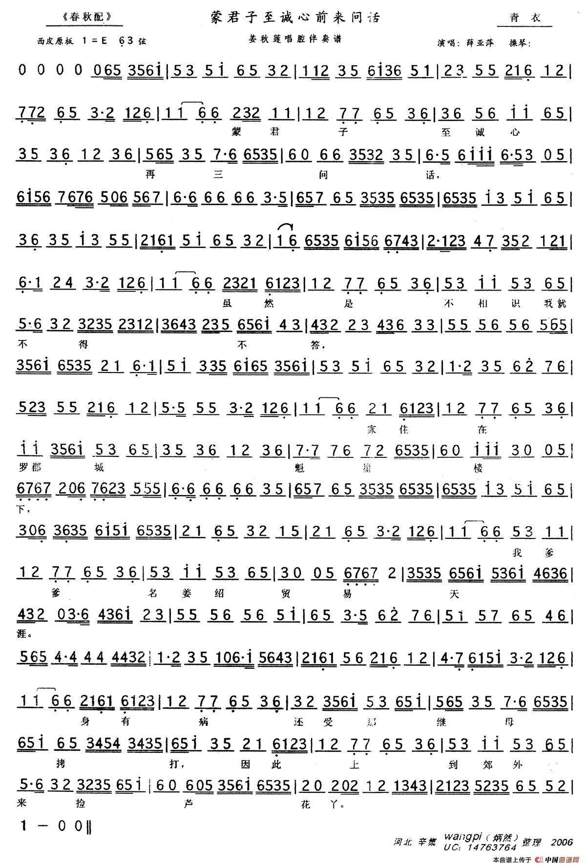 蒙君子至诚心前来问话(《春秋配》姜秋莲唱段、伴奏谱)相关五线谱