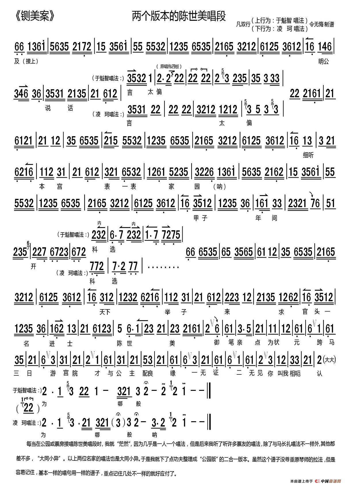 两个版本的陈世美唱段(《铡美案》选段、琴谱)