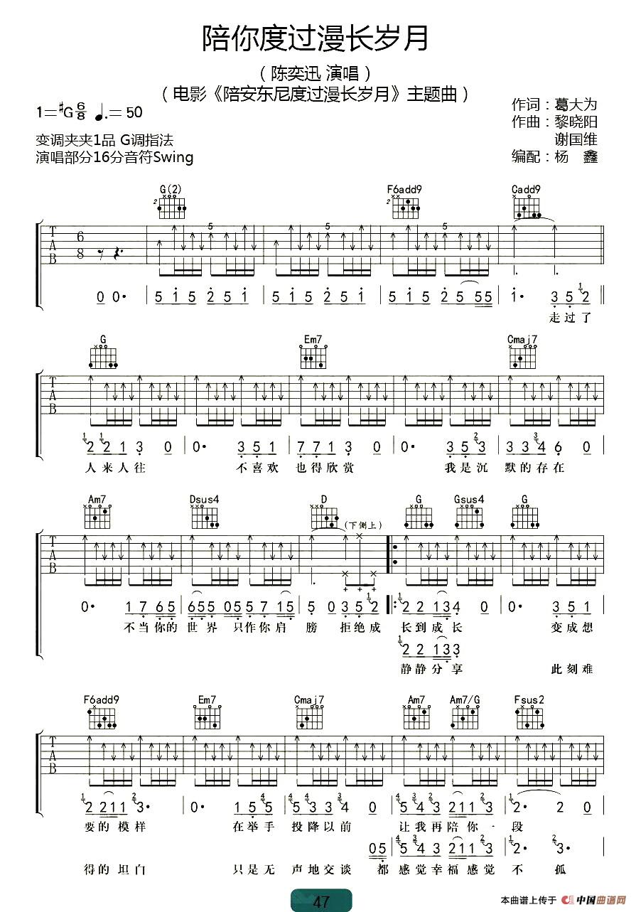 陪你度过漫长岁月(杨鑫编配版)相关五线谱