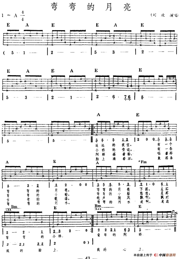 民族吉他弹唱:弯弯的月亮相关五线谱