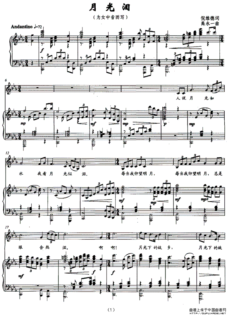 禹永一曲谱推荐图们江之恋沧桑蝶梦(电视剧《暗花》片头曲)乱世情缘(电视剧《经纬天地》片尾歌)太阳风筝(李藜词 禹永一曲)博爱(郭村月)情缘(电视剧《陈真后传》主题歌)春天(吴雪玲词 禹永一曲、正谱)北方男子汉故乡雨(赵越词 禹永一曲 、正谱)我的中国(潘月剑词 禹永一曲)月光里的歌声眷恋中国让我靠近你(正谱)我的中国(潘月剑词 禹永一曲)堂堂中国人(电视剧《陈真后传》主题歌)沂蒙之恋(小提琴+钢琴伴奏)我有一支蓝色的歌水巷弯弯堂堂中国人(电视剧《陈真后传》主题歌)中国,我的主题歌(梁和平词 禹永一曲)