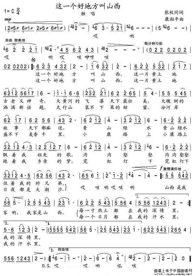 这一个好地方叫山西(张枚同词 康湘平曲)相关五线谱