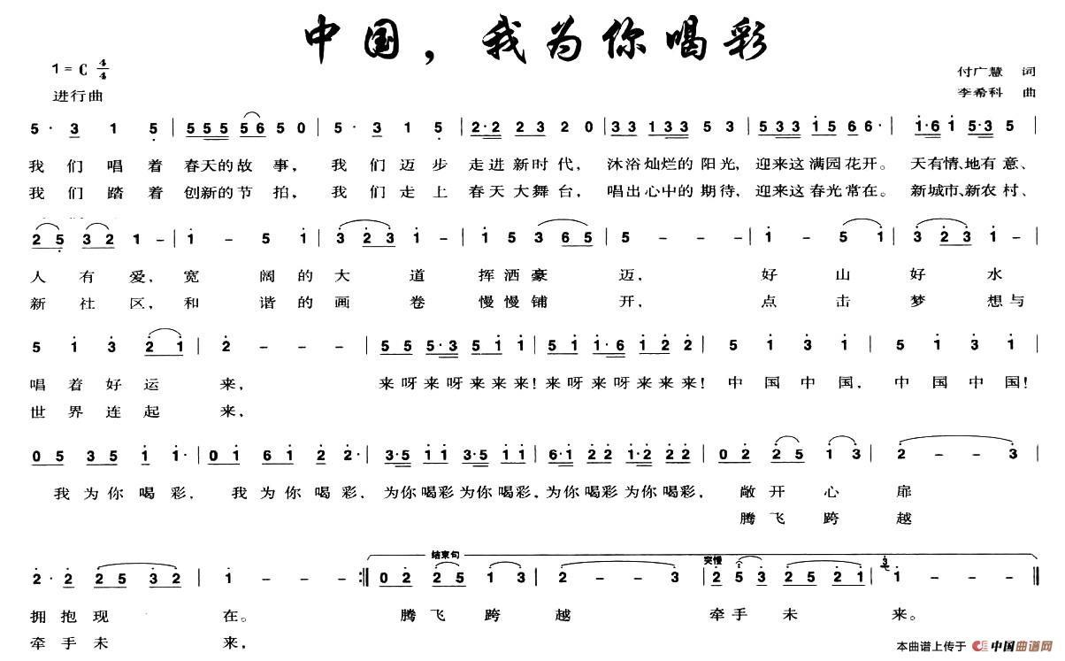 中国,我为你喝彩(付广慧词 李希科曲)相关五线谱