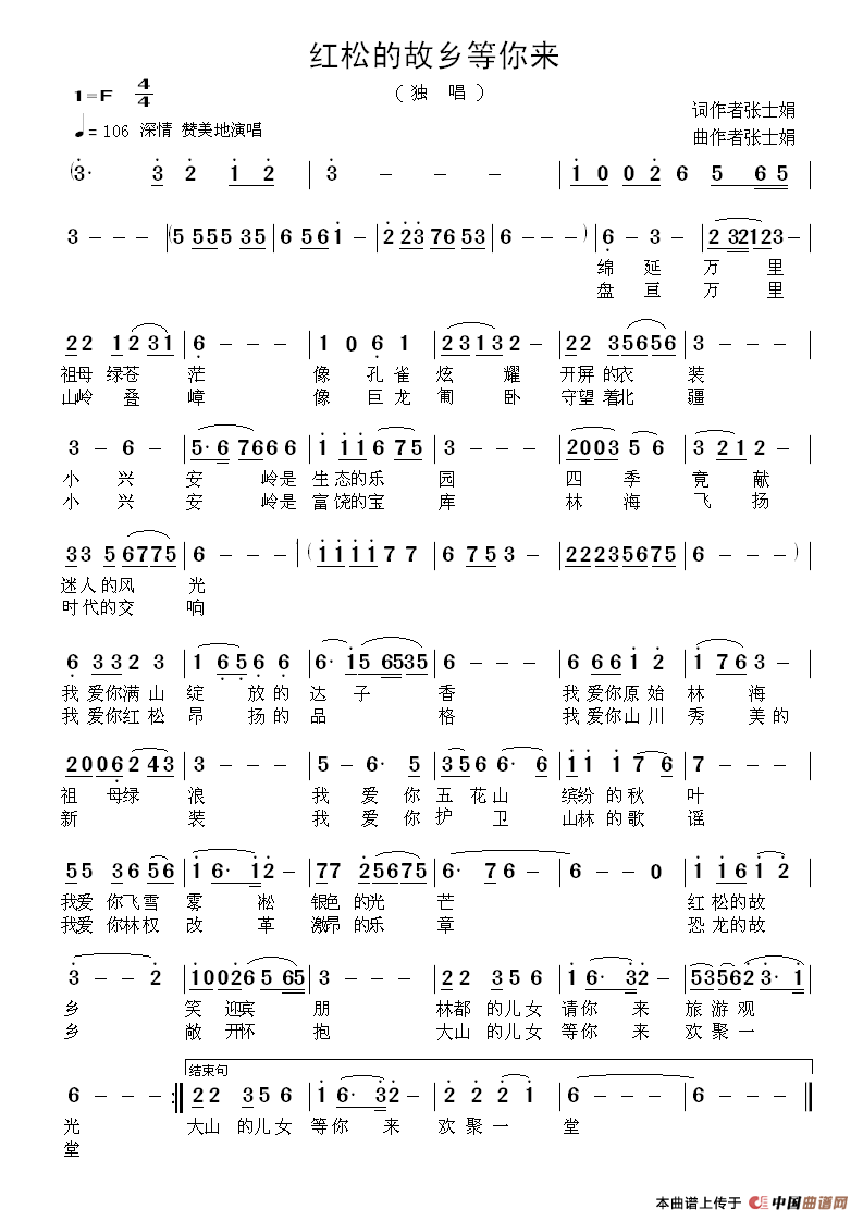 张士娟曲谱推荐兄弟姐妹你们都好吗(又名:小的时候)这份爱我给草原唱情歌玫瑰嫣红千古情(杨志广 刘彤词 张士娟曲)我曾是一名军人草原之恋(温娜词 张士娟曲)啊 我们醉了曦大美鹤城 我的家千里之外的思念婚礼之歌(张士娟词 张士娟曲)珍惜每一天绿色的大草原圣洁的青海湖达子香花儿开了今生今世爱上你辛苦了 交警祖国 我与你同在黄山美(许顺民词 张士娟曲)绿色伊春,我可爱的家乡