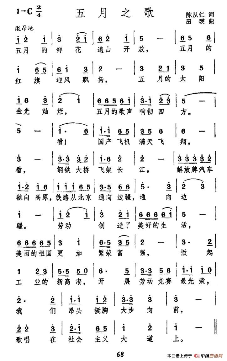 五月之歌(陈丛仁词 田瑛曲)相关五线谱