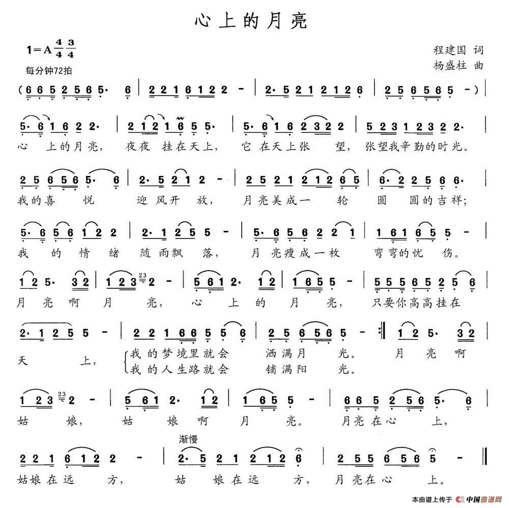 杨盛柱曲谱推荐春风荡漾(钱建隆词 杨盛柱曲)弯月亮(江满平词 杨盛柱曲)喜上眉梢(雷无声词 杨盛柱曲)今宵月正朗(唐明辉词 杨盛柱曲)问月亮(李长鸿词 杨盛柱曲)边关品月秋月弯弯月照荷塘(彭子柱词 杨盛柱曲)牧民的蒙古包走月亮(陈道斌词 杨盛柱曲)长城的月亮(刘志毅词 杨盛柱曲)秦淮踏月(李朝润词 杨盛柱曲)