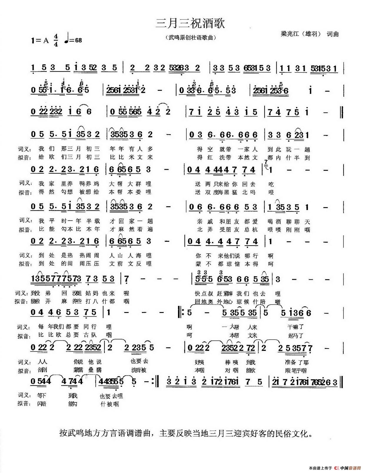 梁兆江曲谱推荐三月三祝酒公达(外公)(壮语歌曲)蒙优勒(你在哪)(壮语歌曲)壮乡人民创新村庄稼情歌(又名:壮家情歌)邕城之恋老同学聚会(梁兆江 词曲)忘不了(捱得痕)(壮语歌曲)向北雷衣(从前小时候)(壮语歌曲)