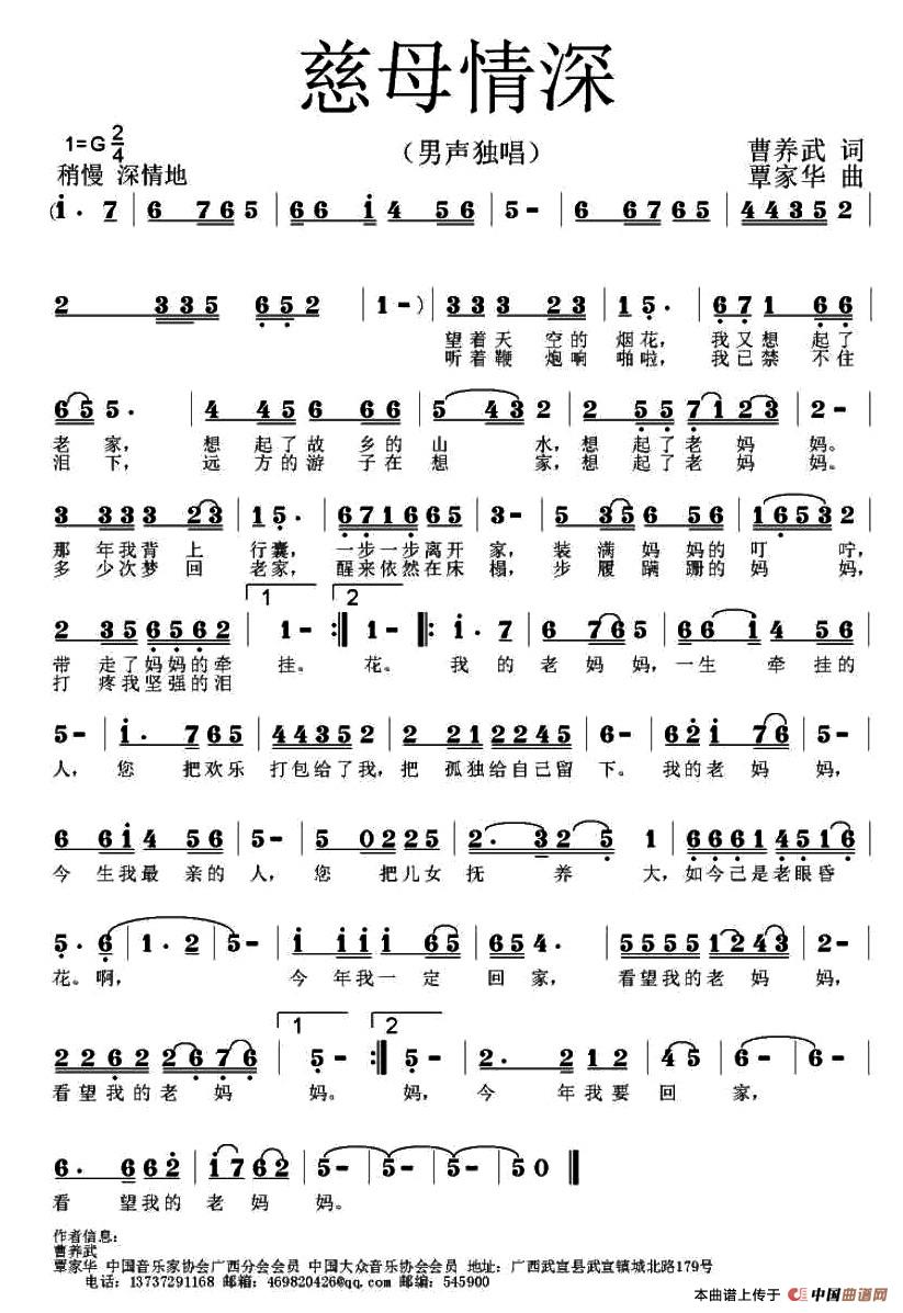 覃家华曲谱推荐乌江,母亲河鄂伦春娃娃爱林海(丁志强词 覃家华曲)中华民族好儿郎叱咤商海我们歌唱夕阳红(为广州市关工委而作)相聚延安秋(闫世卿词 覃家华曲)老字歌(为广州市关工委而作)梁山好汉孝行天下 (曹养武词 覃家华曲)又唱春天的故事彝家娃娃唱家乡(丁恩昌词 覃家华曲)飞翔(陈世慧词 覃家华 刘静曲)美丽宝溪我爱你(广东省英德市九龙镇宝溪村歌曲)家乡 (刘忠 词曲)扬帆起航奔小康跟我去看大草原拥抱世界唱支歌儿献给草原接过朱爷爷的扁担(四川省南充市仪陇县朱德红军小学校园歌曲)